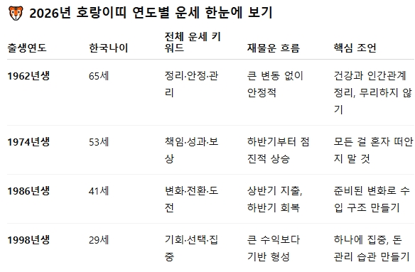 공통적으로 호랑이띠는 2026년에 내 위치에 맞는 속도를 찾을수록 운이 편안해집니다.