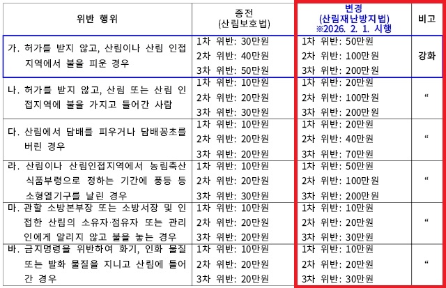 산림 인접지 불 피우기 과태료는 과거에는 최대 50만원 이었는데 200만 원으로 4배 상향되었는데요. 이는 2026년 2월 1일부터 시행된 산림재난방지법이 기존 산림보호법 보다 처벌 수위가 높기 때문입니다.